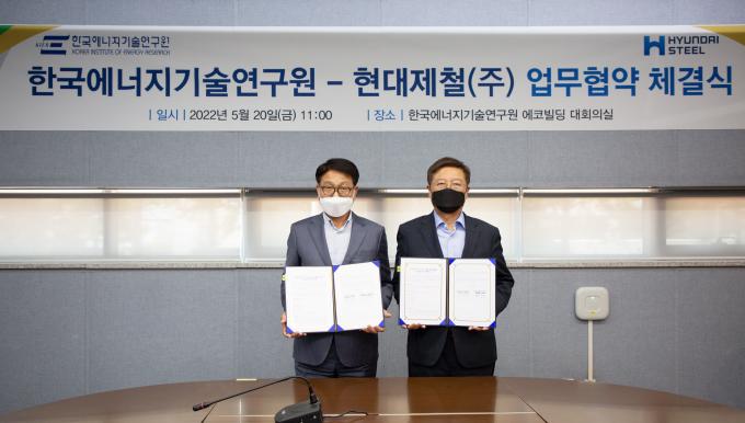 현대제철은 20일 대전 한국에너지기술연구원에서 'CCUS(탄소포집·활용 저장 기술), 수소 생산 및 에너지 효율 향상 기술 협력을 위한 탄소중립 MOU'를 체결했다.