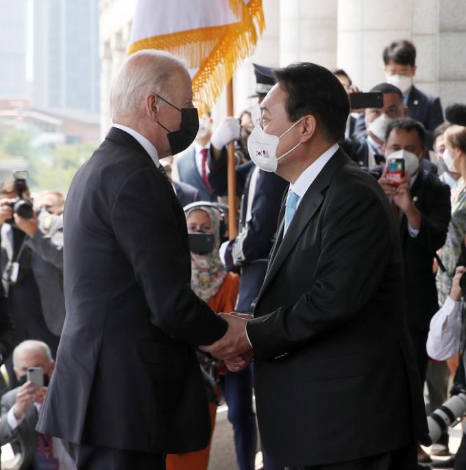 한미 정상은 악수로 짧은 인사를 나눈 뒤 청사 안으로 향했다. 전날 삼성 반도체 공장에서처럼 바이든 대통령이 윤 대통령의 왼쪽 팔을 두세 번 두드렸다.