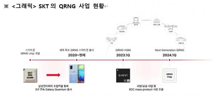 이어 IDQ·비트리와는 QRNG의 기술 진화를 목적으로 차세대 QRNG 칩 개발을 추진하고 있다. SKT는 지난 2020년부터 QRNG 칩을 개발해 '갤럭시 퀀텀'에 탑재한 바 있다. 2024년을 목표로 기존 QRNG 칩 대비 더 작고 저렴하며 개선된 성능의 차세대 QRNG 칩 상용화를 준비하고 있다.
