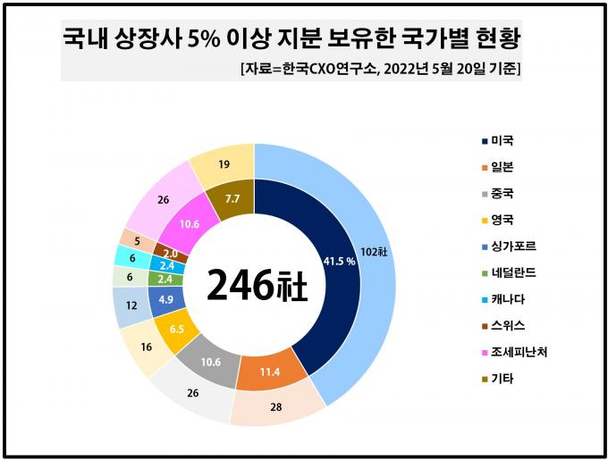 외국계 투자자가 국내 상장사에 5% 이상의 지분을 가진 곳은 2016년 3월 227개였으나 올해는 164개로 줄었다. 투자 대상 국내 기업 수도 322곳에서 164개로 감소했다.