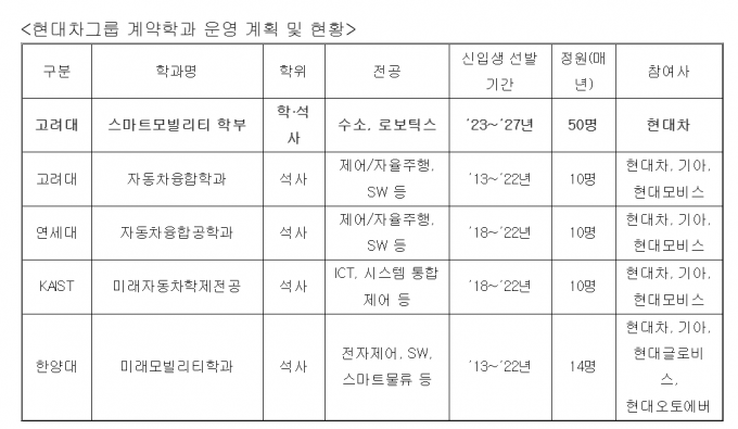 현대차는 "국내 최초 채용조건형 학∙석사 통합과정으로 운영될 예정인 스마트모빌리티 학부는 현대차 미래 모빌리티 사업의 핵심인 수소, 로보틱스 2개 분야의 특화 인재 육성에 중점을 둔다"고 말했다.