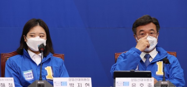 ▲ 더불어민주당 박지현, 윤호중 공동비대위원장이 지난 25일 국회에서 열린 국정균형과 민생안정을 위한 선대위 합동회의에서 굳은 표정으로 앉아 있다. [뉴시스]