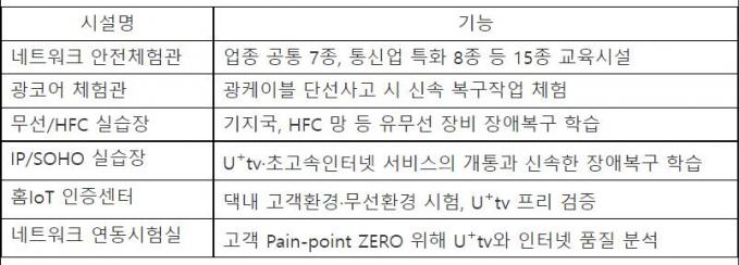 품질안전 종합훈련센터는 안전을 위한 시설인 △네트워크 안전체험관 △광코어 체험관 △무선/HFC 실습장 △IP/SOHO 실습장 등 4개의 훈련장과 서비스 품질을 개선하기 위한 시설인 △홈IoT 인증센터 △네트워크 연동시험실 등 2개의 시험실로 구성돼 있다.