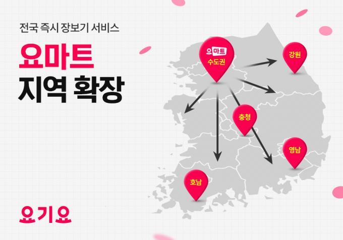 2일 요기요에 따르면 5월 선보인 '요마트'는 GS리테일의 전국 기반 대형 유통망을 활용한 요기요의 퀵커머스 서비스다. 론칭한 지 보름여 만에 수도권은 물론 강원, 충청, 호남, 영남 등으로 서비스 지역을 확장했다.