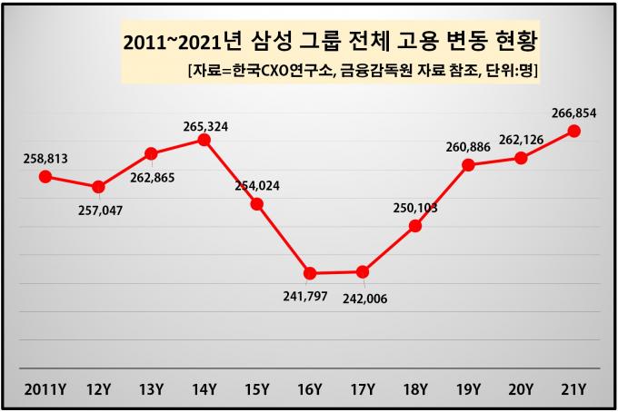 삼성은 2013년 처음 26만 명대에 진입한 이후로 9년째 '27만 명'의 벽을 넘지 못했다.