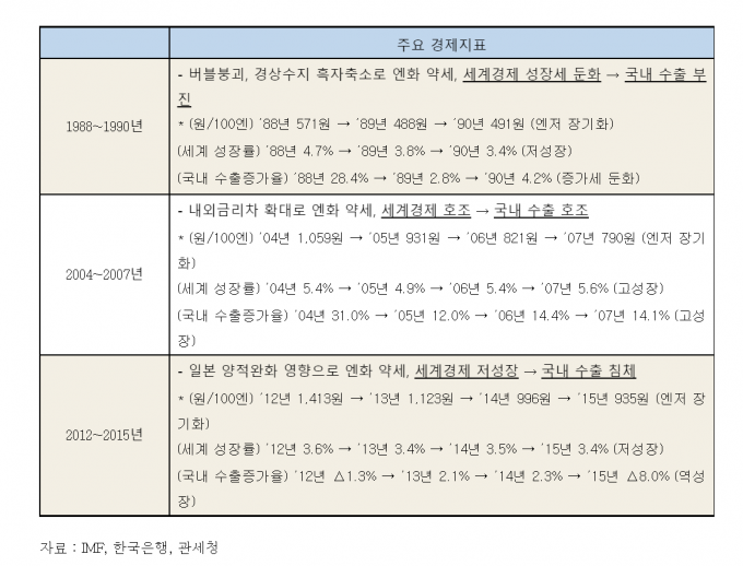엔화 약세와 국내 수출 간 관계는 세계경기 상황에 영향받을 것으로 진단했다. SGI는 "세계경제 둔화 속에 엔화 약세가 동시 진행되었던 1988~90년, 2012~15년에 국내 수출은 큰 폭의 둔화를 경험했다는 사실"에 주목하며 "엔저 추이와 거시경제 변수 움직임에 대해 면밀한 모니터링이 필요하다"고 주장했다.