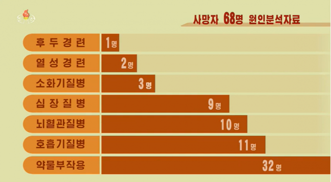 ▲ 북한이 지난 5월 24일 발표한 전국적인 전염병전파 및 치료상황 통보(5월 21일 18시~22일 18시)에서 국가비상방역사령부가 밝힌 사망자 원인분석 자료. [조선중앙TV 캡처]