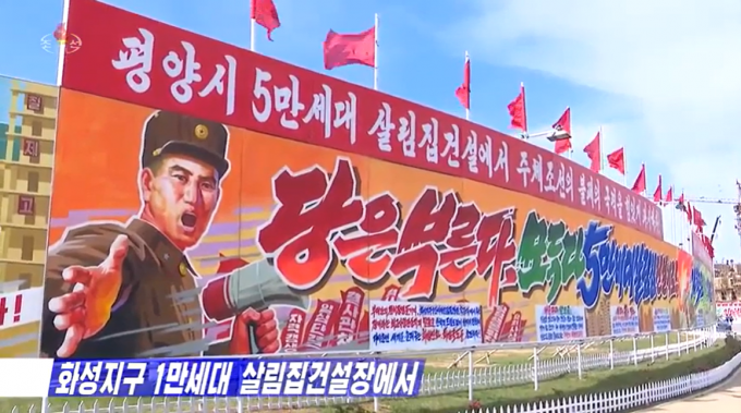 ▲ 지난 5월 24일 조선중앙TV가 보도한 평양시에 내걸린 경제개발 5개년계획 이행을 독려하는 선전화. RFA는 최근 평양시 화성지구 1만 세대 주택 건설 공사 등에 동원된 군인들을 대상으로 지난 5월 18일 중국산 코로나19 백신 접종이 진행됐다고 보도했다. [조선중앙TV 캡처]