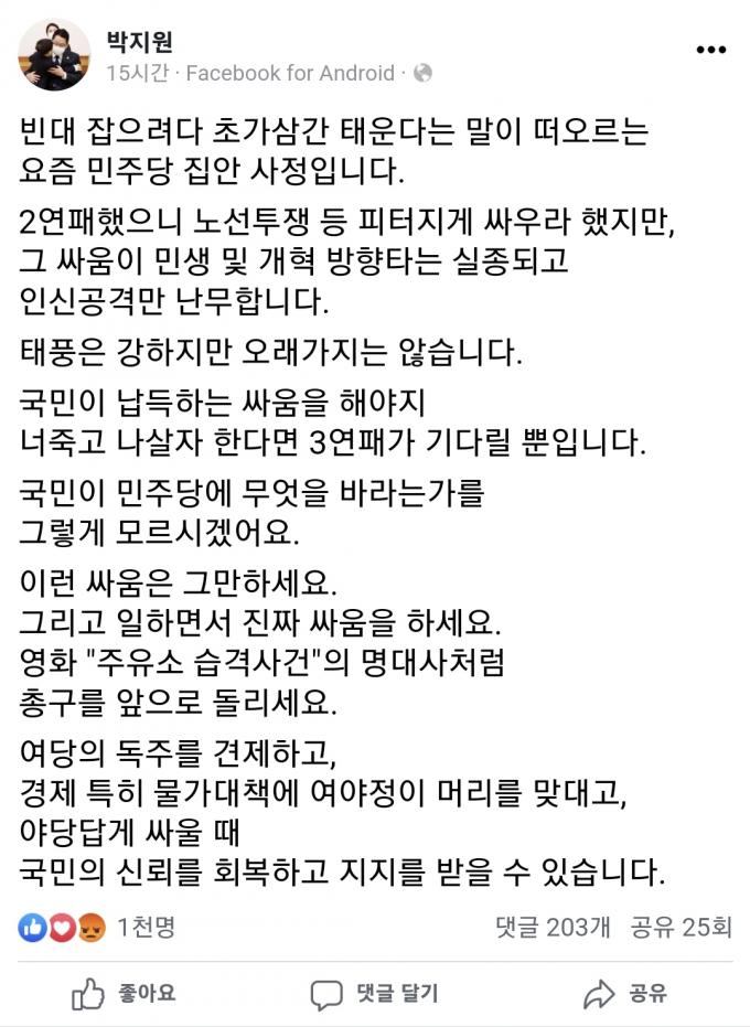 박 전 원장은 5일 페이스북에 "2연패했으니 노선투쟁 등 피터지게 싸우리라 했지만, 그 싸움에 민생 및 개혁 방향타는 실종되고 인신공격만 난무한다"고 비판했다.