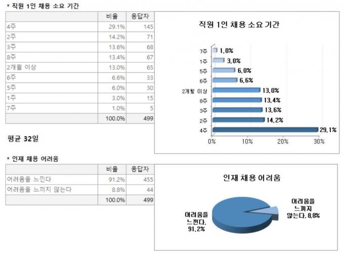 직원 1인 채용에만 한 달 가량 소요되는 것을 미뤄 볼 때, 인재 채용에 상당한 시간을 들여야 하는 셈이다. 이처럼 채용에 드는 시간과 비용이 적지 않음에도 채용 결과가 좋지 않아 어려움을 느끼는 기업이 많았다.