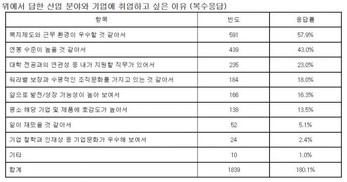 위의 기업에 취업하고 싶은 이유로는 '복지제도와 근무 환경이 우수할 것 같아서'(57.9%)가 가장 높았다. 다음으로 연봉 수준이 높을 것 같아서(43.0%), 대학 전공과의 연관성 등 내가 지원할 직무가 있어서(23.0%), 워라밸 보장과 수평적인 조직문화를 가지고 있는 것 같아서(18.0%) 등으로 답했다.
