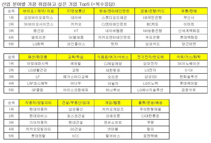 전기전자/반도체 분야에서는 삼성전자·LG전자·삼성SDI, 방송/엔터테인먼트 분야에서는 스튜디오드래곤·CJ엔터테인먼트·네이버웹툰 순이었다. 금융/은행/카드 분야는 KB국민은행·BC카드·NH농협은행 순으로 답했다.