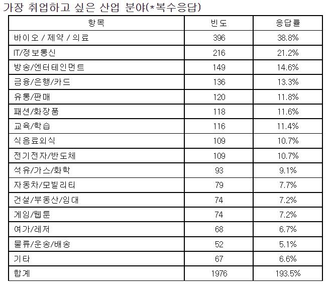 취업하고 싶은 산업 분야 1위는 바이오/제약/의료(38.8%)였고, IT/정보통신(21.2%), 방송/엔터테인먼트(14.6%)가 뒤를 이었다. 성별 응답에선 1, 2위는 전체 순위와 같았지만, 남성은 전기전자/반도체(13.3%)와 석유/가스/화학(13.3%)을 공동 3위로 꼽았고, 여성은 방송/엔터테인먼트(18.3%)와 패션/화장품(16.7%) 분야 취업 선호도가 높았다.