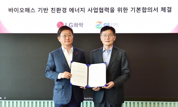 ▲ LG화학 노국래 석유화학사업본부장(왼쪽)과 GS EPS 정찬수 대표이사가 바이오매스 기반 친환경 에너지 사업협력을 위한 기본합의서(HOA)를 체결하고 기념촬영을 하고 있다. [LG화학 제공]