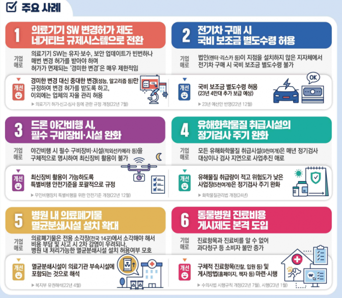 10건의 규제가 개선되는 바이오헬스케어는 △의료기기 SW 변경허가제도가 네거티브 규제시스템으로 전환하고 △병원내 의료폐기물 멸균분쇄시설 설치도 확대된다. 동물병원 진료비용 고지제도도 본격 도입된다.
