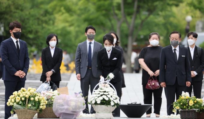 김 여사는 노 전 대통령 묘역에 헌화·분향 후 묵념을 했다. 여성 4명이 김 여사 뒤에 있었다. 이 사진이 언론에 공개되자 네티즌들은 머리를 하나로 묶고 반소매를 입은 여성의 정체를 의심했다. 정장을 차려 입은 김 여사와 다른 여성들에 비해 예를 갖추지 않은 옷차림 때문이었다. 일부 커뮤니티에서는 한 무속인과 닮았다는 게시물이 올라오기도 했다.