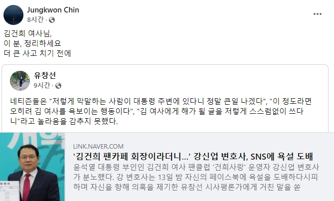그러자 강 변호사는 "불만이 있으면 합리적 논리적으로 비판할 일이지 왜 건희사랑과 매관매직척결국민연대를 연결시키냐"고 따졌다. 그는 "내가 올린 글은 유창선 씨의 대응이 나올 때까지 일단 내리겠다"며 돌연 자신의 욕설 글을 모두 삭제했다. 또 진 전 교수를 향해 "여사 위하는 척 남 사고 치는 걱정하지 말고 너나 잘하세요"라고 했다.