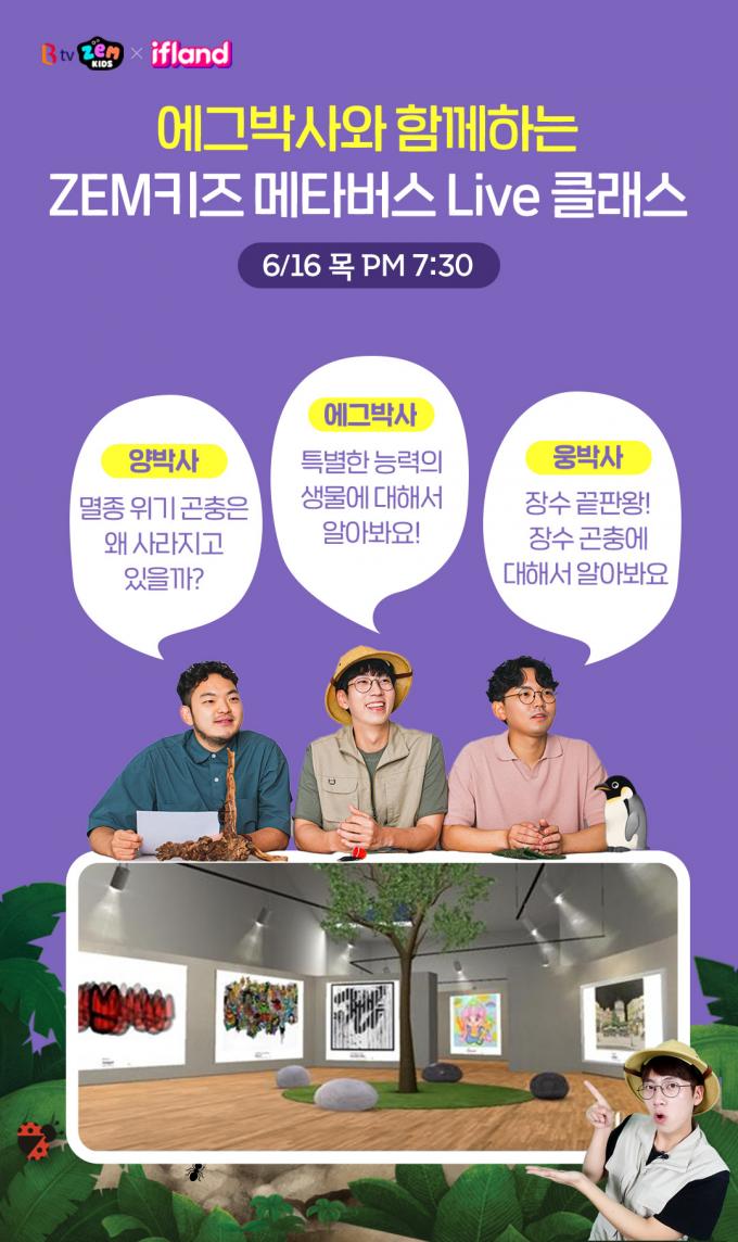 잼키즈 클래스는 16일 오후 7시 30분 '이프랜드'에서 1시간 동안 열린다. 대상은 7~9세 유초등생이다. 곤충·동물 중심의 자연 관찰 콘텐츠로 유튜브 구독자 44만 명이 넘는 인기 크리에이터 '에그 박사'와 그 동료 '양박사', '웅박사'가 아바타로 등장해 다양한 수업을 진행한다.