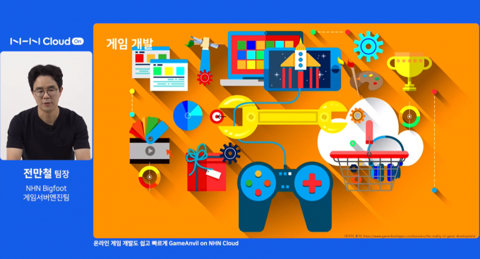 전만철 NHN 게임서버엔진팀장은 21일 '게임엔빌 온 NHN클라우드(GameAnvil on NHN Cloud)' 웨비나에서 "게임 개발 엔진으로 개발자가 싱글 플레이가 가능한 게임을 만들었어도 이를 온라인 버전으로 확장시키는 것에 어려움을 느끼는 경우가 많다"며 "이를 쉽게 확장시킬 수 있도록 한 서버 엔진이 게임엔빌"이라고 소개했다.