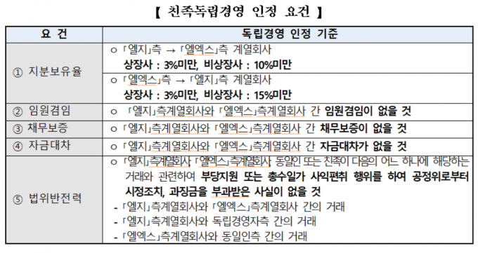 공정위는 이를 검토한 결과 LG와 LX가 △지분보유율 △임원겸임 △채무보증 △자금대차 등 친족독립경영 인정 요건을 모두 충족했다고 설명했다.