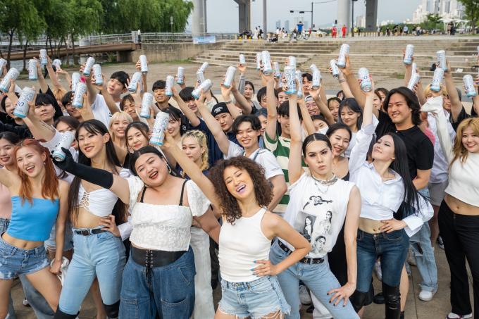 ▲ 댄서 '러브란'과 메가 크루들이 지난 18일 오비맥주 카스 0.0를 들고 한강공원서 플래시몹을 펼쳤다. [오비맥주 제공]