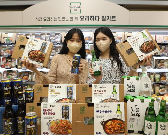 롯데칠성음료는 롯데마트에서 처음처럼/클라우드 컬래버 밀키트를 출시했다. 롯데마트는 이달 29일까지 밀키트 제품과 '처음처럼(페트 400ml*6입)', '클라우드 칼로리 라이트(500ml*6입)', '클라우드 생 드래프트(500ml*6입)'를 동시 구매할 경우 밀키트를 20% 할인해 주는 행사를 진행한다.