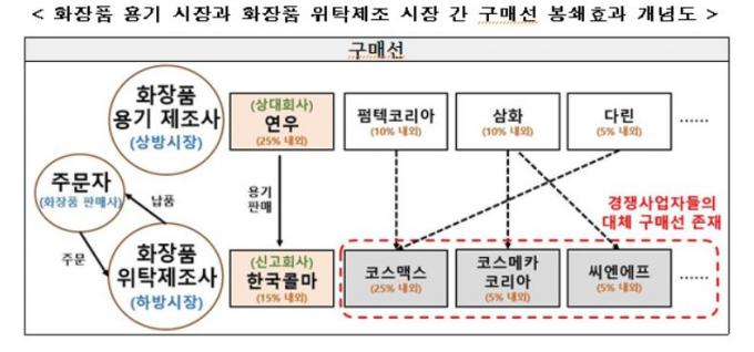 LG생활건강, 아모레퍼시픽, 에스티로더, 엘오케이(로레알), 애경 등 화장품 판매사가 용기의 규격과 디자인을 정하는 등 거래를 주도하고 협상 우위에 있어 두 회사가 경쟁 업체들을 배제할 가능성은 적을 것이란 설명이다.