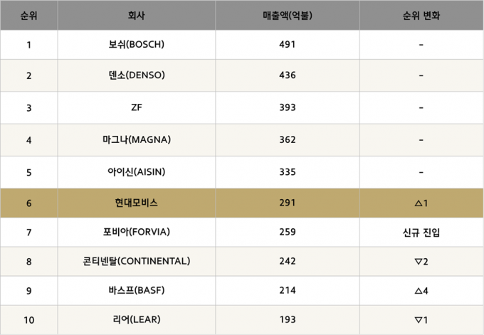 글로벌 10대 부품사로는 전년 대비 1위에서 5위까지 순위가 동일한 가운데, 프랑스 포레시아(Faurecia)와 독일 헬라(Hella)가 합병해 덩치를 키운 포비아(Forvia)가 현대모비스의 뒤를 이어 7위에 올랐다.
