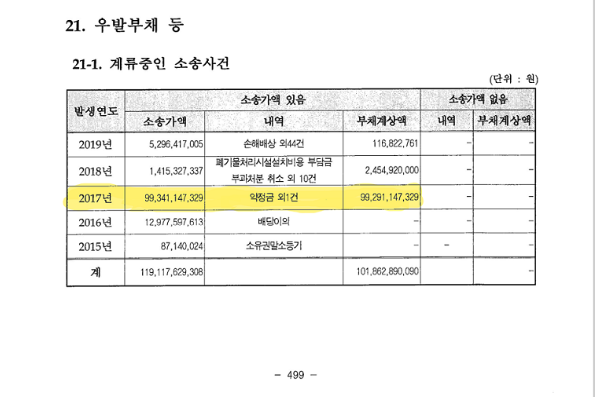 그 내용은 1심 판결로 결정된 해지시지급금 2146억 중 명시적일부청구금 1153억 원을 공탁한 뒤 항소했기 때문에 나머지 993억 원이 계류 중인 소송사건의 우발부채라는 것.