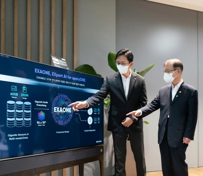 ▲30일 오전 서울 마곡 LG사이언스파크에서 배경훈 LG AI연구원장이 이정식 고용노동부 장관에게 LG의 초거대 AI EXAONE(엑사원) 기술을 소개하고 있다. [LG 제공]