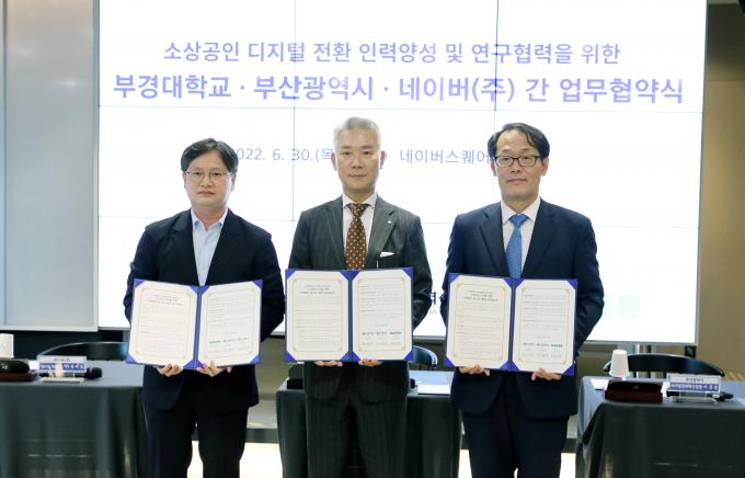 네이버는 지난 30일 부산 해운대구에 위치한 네이버스퀘어 부산에서 부경대 및 부산시와 '소상공인 디지털 전환 인력양성 및 연구 협력' 업무 협약을 체결했다.