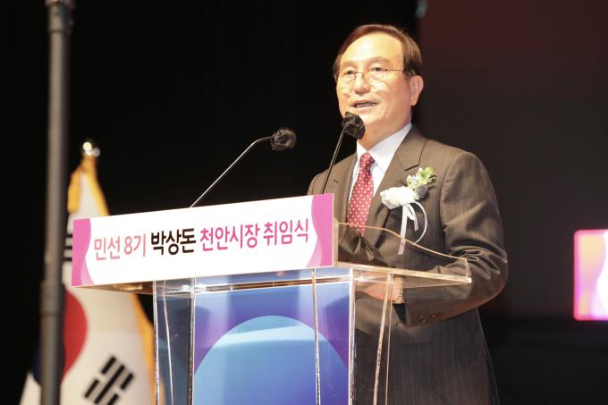 ▲1일 취임식에서 인사말을 하고 있는 박상돈 천안시장.[천안시 제공]