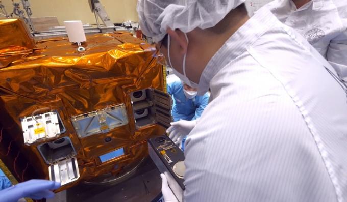 ▲ 한국과학기술원(KAIST) 학생이 지상에서 큐브위성 '랑데브'(RANDEV)를 성능검증위성에 탑재하고 있다. [한국항공우주연구원 제공]