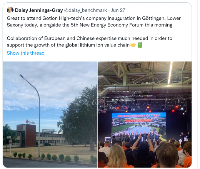 ▲ 시장조사기관 벤치마크의 연구원이 지난달 22일 열린 '궈시안 독일 공장 발표' 행사에 참석한 뒤 자신의 트위터에 올린 사진. [daisy_bechmark 트위터 캡처]