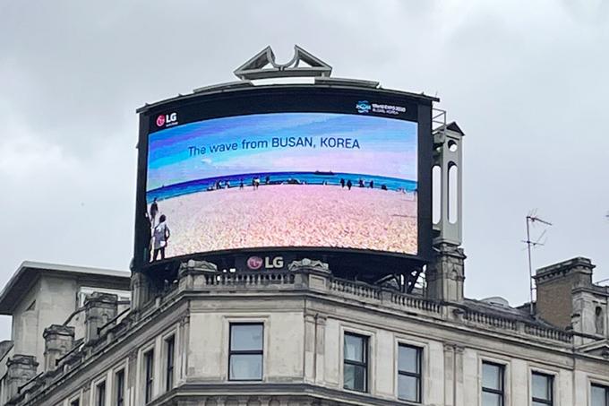 ▲재계가 '2030 부산세계박람회' 유치를 위해 총력 지원에 나섰다. 사진은 영국 런던 피카딜리광장의 전광판. LG전자의 부산엑스포 유치 기원 홍보 영상이 나오고 있다. [LG전자 제공]