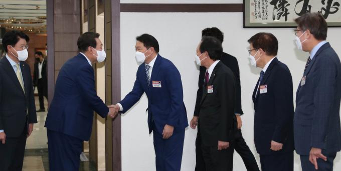 ▲4월 22일 경제계 부산세계박람회 유치기원 대회에서 당시 윤석열 대통령 당선인(왼쪽)과 최태원 대한상의 회장(SK그룹 회장)이 악수하고 있다. [대한상의 제공]