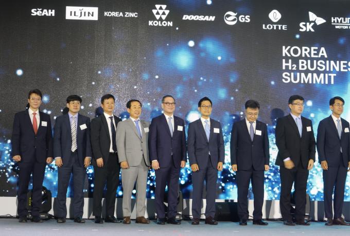 ▲ 장희구(왼쪽 네번째) 코오롱인더스트리 사장이 6일 서울 동대문 디자인플라자(DDP)에서 열린 '코리아 H2 서밋 인베스터데이'에 참석해 기념 촬영을 하고 있다. [코오롱그룹 제공]