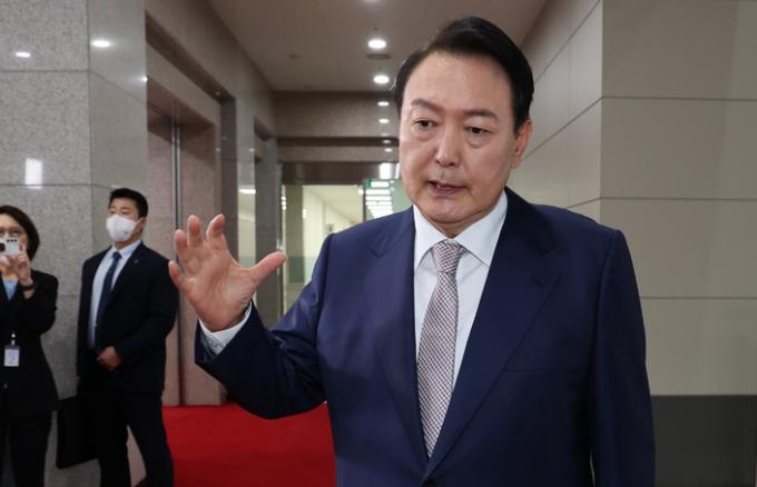 ▲ 윤석열 대통령이 8일 서울 용산 대통령실 청사로 출근하며 취재진 질문에 답하고 있다. [뉴시스]