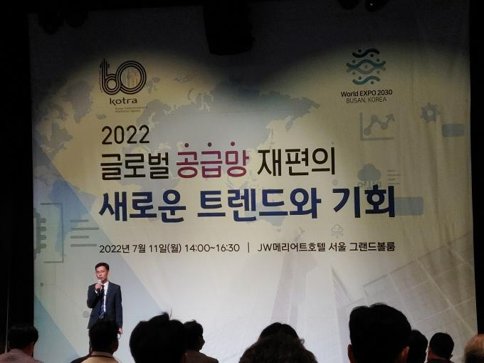 11일 대한무역투자공사(KOTRA)가 JW매리어트호텔서울에서 개최한 '2022 글로벌 공급망 재편의 새로운 트렌드와 기회' 포럼에서 산업연구원 김바우 전문연구원은 "한국의 대중국 중간재 취약성은 미국이나 일본보다 높아 관심이 필요하다"고 주장했다.