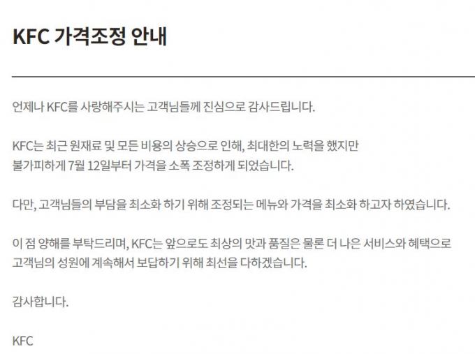 ▲ KFC 가격 인상 공지문. [KFC 홈페이지 캡처]