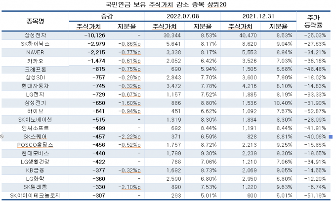 특히 삼성전자는 지분율 변동이 없었음에도 주식가치 감소액이 가장 컸다. 삼성전자(지분율 8.53%)의 주식 가치는 2021년 40조4700억원에서 2022년 7월 30조3438억원으로 줄었다.
