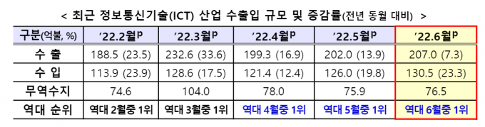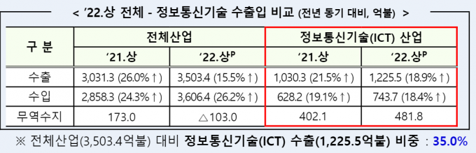 전체 산업의 무역수지가 103억 달러 적자인 점을 감안하면 ICT가 적자폭 감소에도 기여한 셈이다. 2022년 상반기동안 우리나라는 수출 3503.4억 달러를 기록하며 전년보다 15.5% 증가하는 실적을 거뒀지만 수입도 전년 같은 기간보다 26.2% 늘어난 3606.4억 달러에 달해 103억 달러 적자를 기록했다.