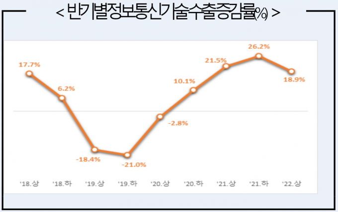 전체 산업 무역수지 적자폭 줄이는 데도 기여 정보통신기술(ICT) 수출이 전년 동기 대비 18.9% 증가한 1225.5억 달러를 달성하며 1996년 이후 상반기 기준 역대 최대 실적을 달성했다. 전체 산업의 상반기 수출액 3503억 달러 중에서는 35%를 점했다.