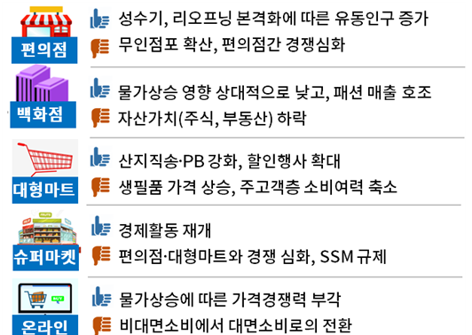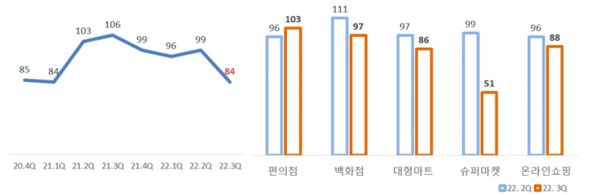 백화점(111→97), 대형마트(97→86), 슈퍼마켓(99→51) 등 다른 오프라인 채널은 비대면채널에 유리한 엔데믹과 리오프닝이라는 훈풍에도 불구하고 지수 하락을 면치 못했다. 온라인쇼핑(96→88)도 엔데믹에 따른 대면소비 증가의 영향을 받을 것으로 예상되며 두 분기 연속으로 기준치(100)를 하회했다.