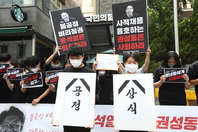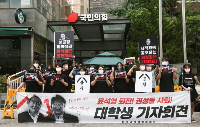 한국대학생진보연합 소속 대학생들이 18일 서울 여의도 국민의힘 당사 앞에서 불공정 비리 정권 윤석열 퇴진과 사적 채용 옹호한 국민의힘 권성동 대표직무대행 겸 원내대표 사퇴를 촉구하는 긴급 기자회견을 하고 있다.