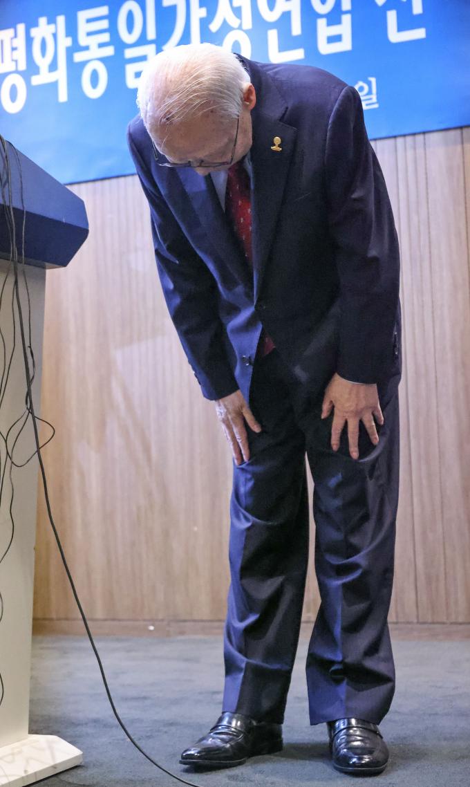 ▲ 곽정환 전 세계평화통일가정연합 세계회장이 19일 기자회견에서 아베 신조 전 일본 총리 피습 사망사건 관련해 고개 숙여 사죄의 인사를 하고 있다. [이상훈 선임기자]
