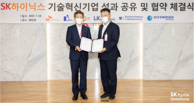 ▲ 19일 경기 이천캠퍼스에서 열린 '6기 기술혁신기업 협약식'에 참석한 곽노정 SK하이닉스 사장과 박종철 디아이티 대표. [SK하이닉스 제공]