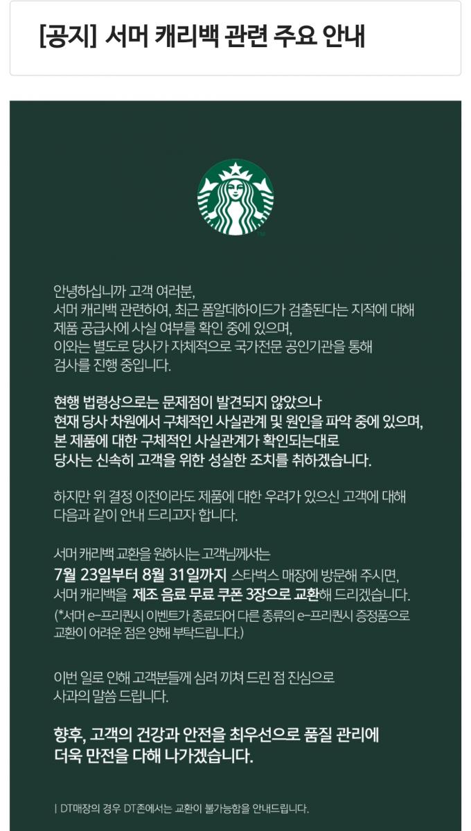 23일 스타벅스는 '서머 캐리백' 유해성 논란에 대해 공지를 통해 "서머 캐리백 교환을 원하는 고객들은 7월 23일부터 8월 31일까지 스타벅스 매장을 방문하면 서머 캐리백을 제조 음료 무료 쿠폰 3장으로 교환해 드리겠다"고 밝혔다.