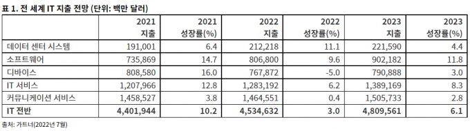 전 세계 소프트웨어에 대한 지출은 2022년에 9.6% 증가한 8068억 달러, IT 서비스에 대한 지출은 1조 3천억 달러에 이를 것으로 추정된다.