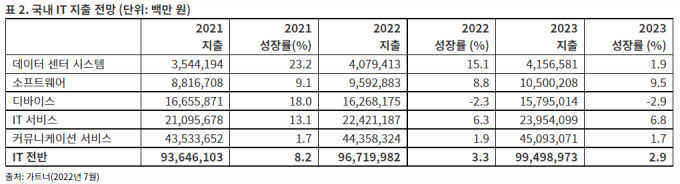 이와 달리 PC, 태블릿, 프린터 등 디바이스는 소비가 줄어 지출이 5% 감소할 것으로 예상했다. 디바이스 소비는 국내에서도 크게 줄어 2021년 18% 증가에서 올해 2.3% 감소할 것으로 전망했다.